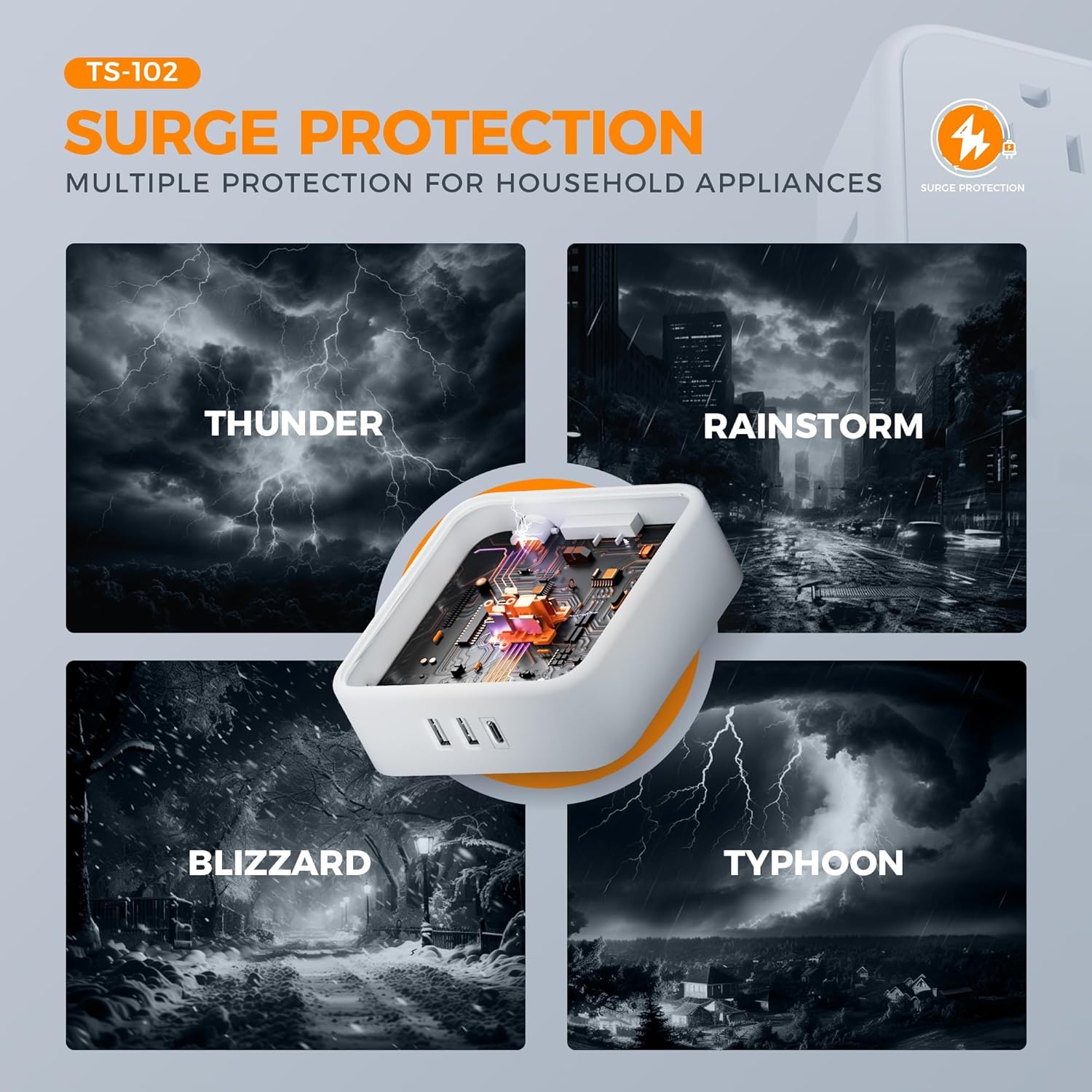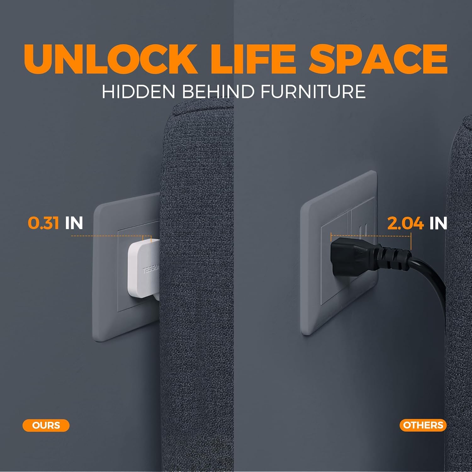 - Flat Head Power Bar: With only 0.31 inch ultra thin plug and 45 degree right angle design, which is mush slimmer than traditional plugs, can close to the wall easily and hide in the back of furniture, no waste for outlet and space